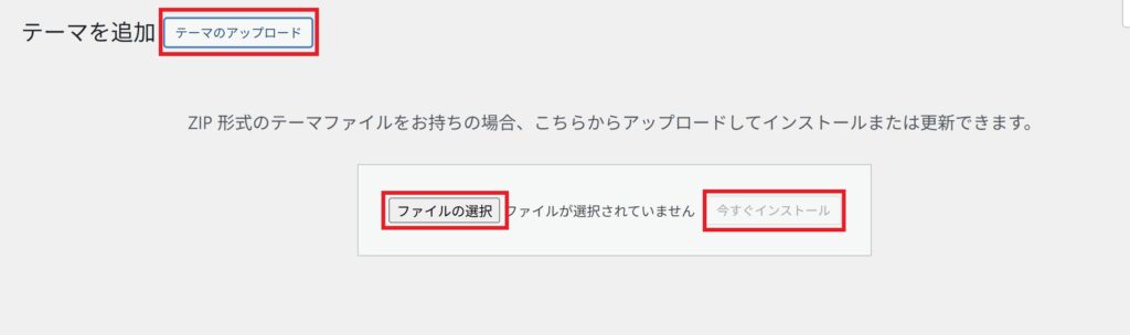 ②『テーマを追加』→『テーマのアップロード』を選択。