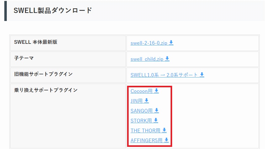 ②『SWELL製品ダウンロード』の乗り換えサポートプラグインから自分のテーマに合ったプラグイン(zip形式)をダウンロード