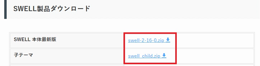 SWELLERS'(ユーザー会員サイト)にログインし『SWELL製品ダウンロード』から『SWELL本体最新版』と『子テーマ』をダウンロード