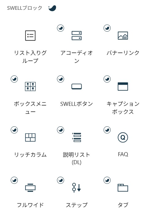 SWELLを導入すると、WordPressに22個の専用カスタムブロックが追加されます。